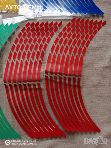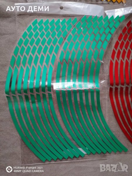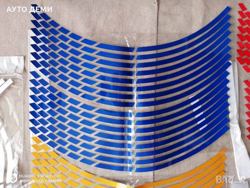 Продавам 5 различни цвята гланцирани самозалепващи стикери за залепване по цялата окръжност на външната периферия на джантата на автомобил ,мотор ,велосипед и др.