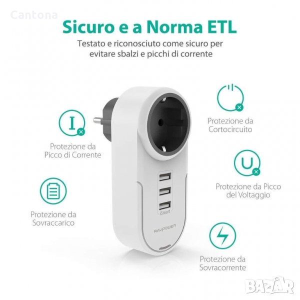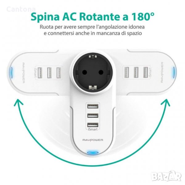 RAVPower USB-A зарядно за телефони и мобилни устройства с 3 USB извода и iSmart технология за зареждане, с европейски контакт, позволяващ Ви да използвате пълнофункционално устройства захранвани с 220V.