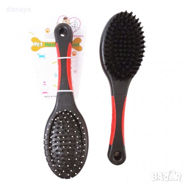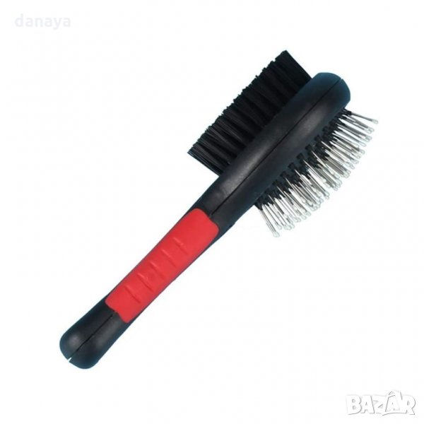 Двойна четка за кучета и котки. Двустранна четка за ресане на домашни любимци. Спомага за лесното разресване и разплитане на козината, премахва излишните косми и я оставя блестяща. Четката има две страни с различно покритие за идеално поддържане и лесно разресване на козината. Метални пинчета със заоблени върхове от едната страна и найлонова четка за повърхностно изчеткване от другата. С помощта на четката лесно може да се отстрани праха и мръсотията от козината само с няколко движения. Дръжката е допълнително подсилена със силиконово уплътнение, за по-стабилен захват.