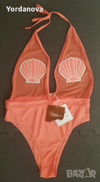 Цял бански костюм на марката Golddigga. Наличен в два цвята - черен и корал. С дълбоко деколте, мрежеста горна част, на която има зашити имитации на мидени черупки, връзки за врата. Хастар - 100% полиестер. Машинно пране.