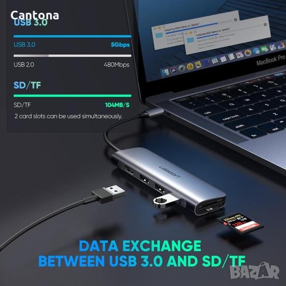 - Разширете възможностите си с повече портове, за да свържете повече устройства и да улесните работата си. UGREEN 6-в-1 USB-C хъб разполага с 4K HDMI изходен порт, четци за SD и TF карти и 3 USB 3.0 порта. И всички концентратори могат да работят едновременно.