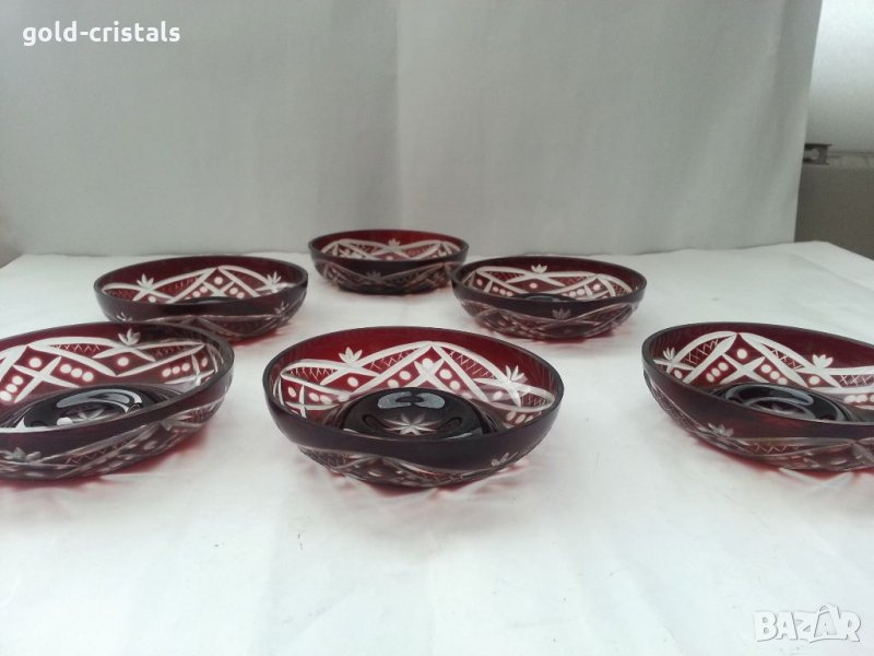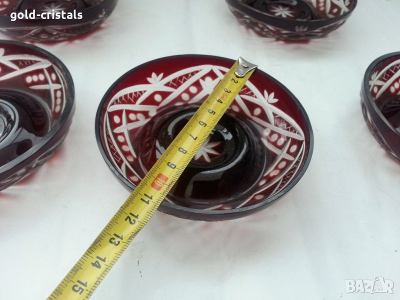 Кристални купички за ядки десерт торта чини чинийки цветен червен рубинено червен кристал ръчно гравирани сервиз комплект сет лот ретро арт декор винтидж колекция старинни антикварни предмети обзавеждане за дома и семейството подходящи за подарък за ценители и колекционери