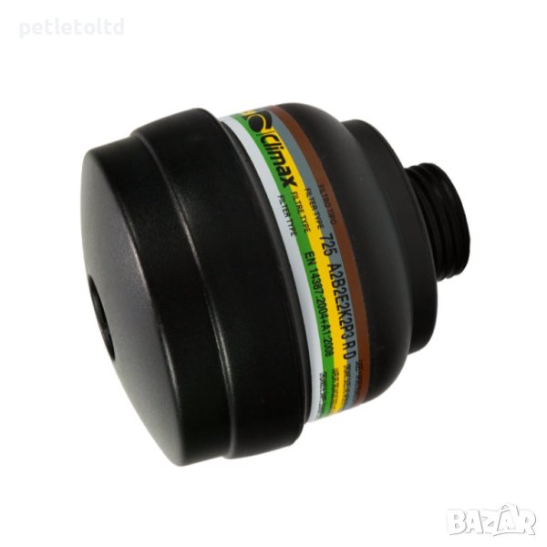 Комбиниран филтър 725 A2B2E2K2P3 за органични газове и изпарения с температура на кипене > 65°С, неорганични и киселинни газове и пари; амоняк и органични амини, твърди и течни аерозоли на водна и маслена основа, радиоактивни и токсични частици, бактерии и вируси.
