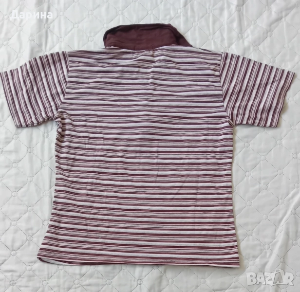 Тениска с яка , кафяво и сиво на райета . Дължина : 64 см , Отделно яка : 10 см , Ширина от рамо до рамо - едностранно : 48 см , Ширина от мишница до мишница - едностранно : 54 см , Ширина в кръста - едностранно : 54 см , дължина на ръкав : 21 см . Изпращам с Еконт за сметка на купувача .