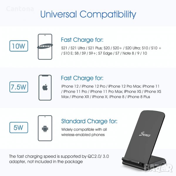 - Безжичното зарядно устройство Qi осигурява бързо безжично зареждане до 15W за LG V30/V40; 10W безжично зарядно устройство за Samsung Galaxy S20/S10e/S10+/S10/S9/S8/S7/S7 Edge/S6 Edge+, Samsung Galaxy Note 10/Note 10+/Note 9/Note 8; 7.5W безжично зарядно устройство за iPhone 11/11 Pro/11 Pro Max/X/XS/XS Max/XR/8/8 Plus и 5W стандартно безжично зареждане за всички телефони с Qi (безжично зареждане за iphone 12 серия поддържа само от QC 3.0 адаптер, продава се отделно)