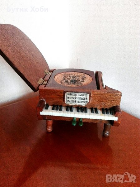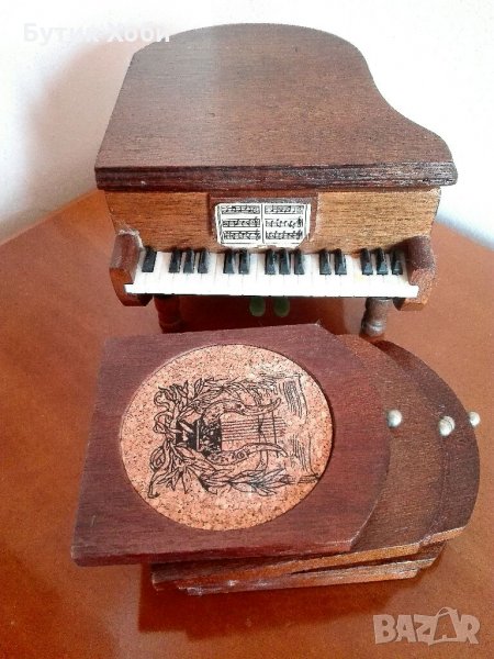 Поставка/контейнер за подложките за чаши във формата на пиано. С отворяем капак.Майсторска изработка от дърво. Шест подложки с корково покритие и метални елементи.Забележка: липсва един метален елемент.Размер пиано : 17х14см. Подложка: 10,5х8,5см.
