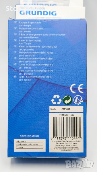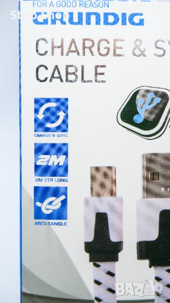 Grundig. Дълъг е 2 м, така че е идеален, когато щепселът е далеч от мястото, където седите, или където можете да поставите телефона / таблета си. Направен е специално против заплитане,зареждане и прехвърляне на данни