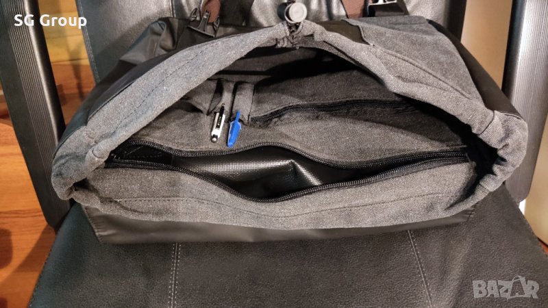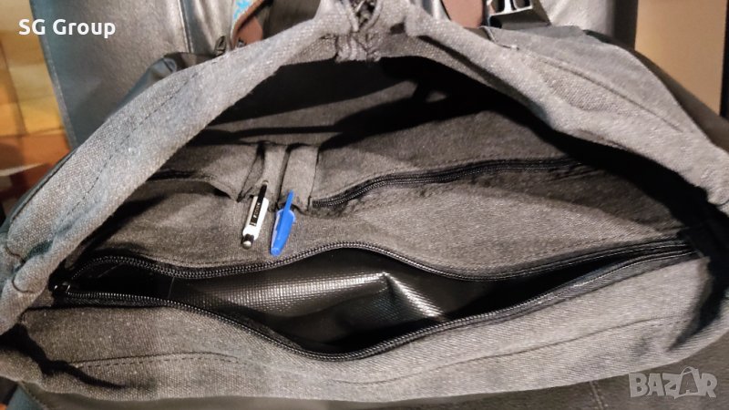 Раницата (чантата)има множество джобове,2 големи вътрешни отделения побирящо до два лаптопа.По -малко отделение за телефони химикалки и другипособия .