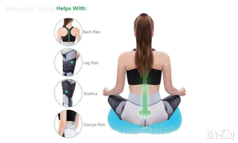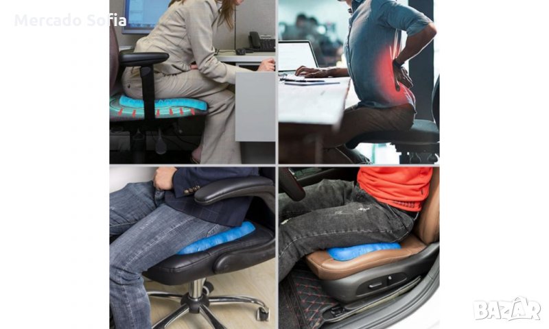 Анатомична възглавница за правилна стойка, удобна и релаксираща с нехлъзгаща се страна. Гъвкавият дизайн с пчелна мрежа, разпръсква натиска на задните части и бедрата и се адаптира идеално към извивката на задните части. Тя е толкова подкрепяща, че можете да седнете на нея, без да я счупите. Уникалната структура на студената възглавница на гел значително намалява топлообмена, който се развива между задните части и седалката, като същевременно увеличава циркулацията на въздуха и поддържа седалката хладна. Дизайнът на възглавницата предлага облекчение от натиска върху опашката на гръбначния стълб, създавайки удобна и удобна позиция за по -добро отпускане на тялото. Възглавницата е с нехлъзгащо се покритие и плат, така че да не се изплъзва от стола. Капакът се сваля и се пере. Подходящ е за дом, офис, кола, пътуване, стадион или инвалидна количка за хора с ограничено или невъзможно движение.