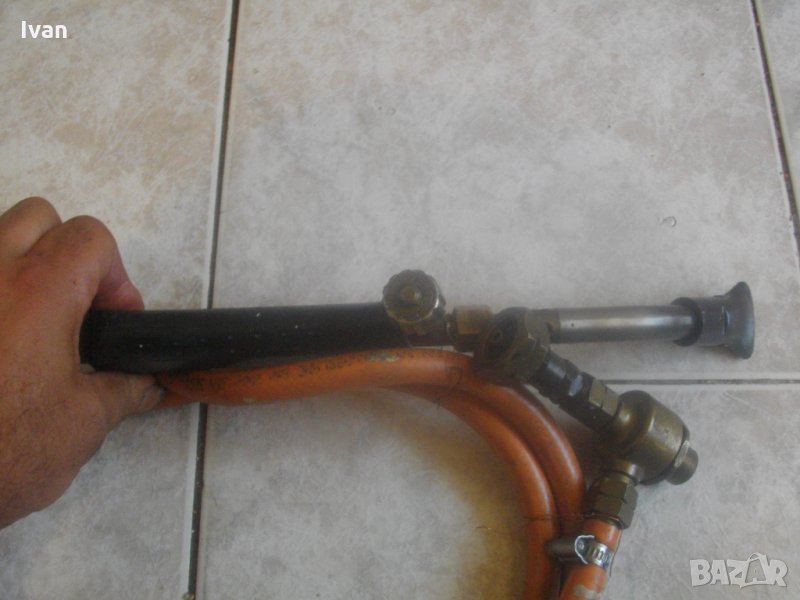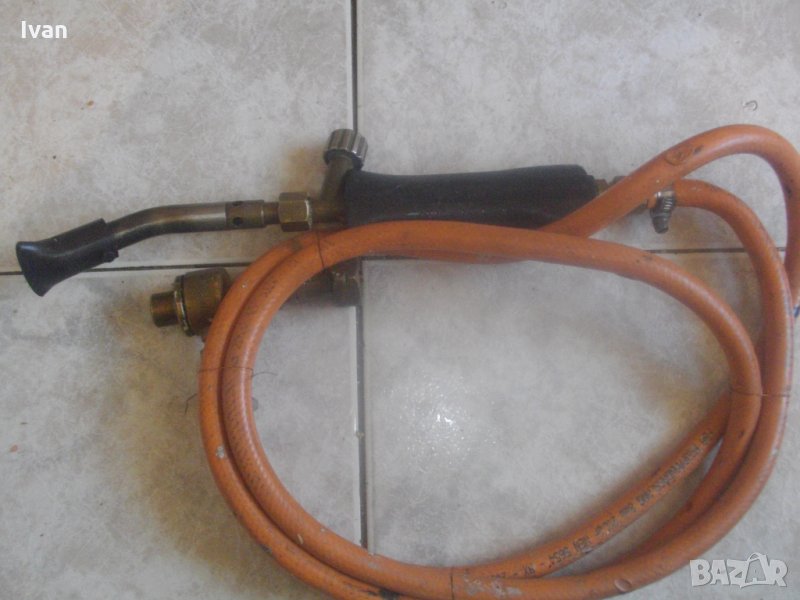 горелка работеща на газ в готово състояние с маркуч и вентил. Дължина на маркуча - 2,80м. Горелка италианска марка и модел - Sioevert Pro 2238. Налягане, означено на нея -4 bar. Маркуч - марка и означения FBA Proppangassling 20 bar - NEN 5654-AX-2000. Марка на винтила - HA SMI. Дължина на горелката - 350 мм. Всички съединителни гайки са налични. Инструмента е готов за употреба след скачване н бутилка газ. Запазен външен вид и отлично техн. състояние.