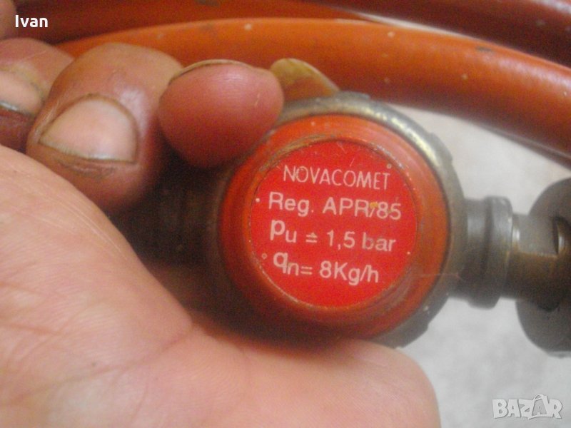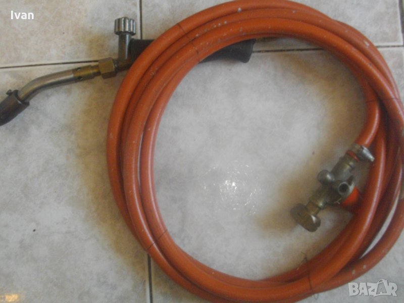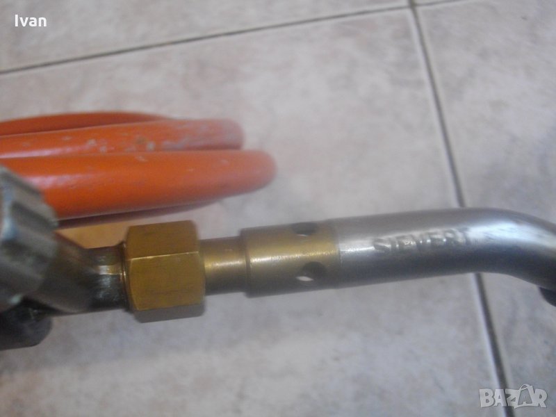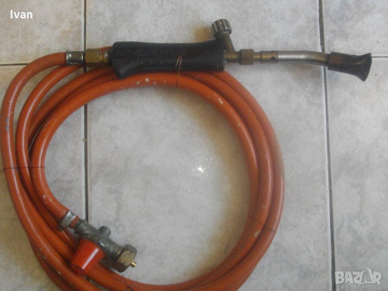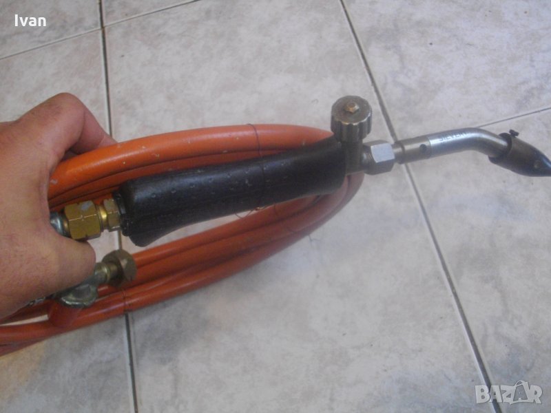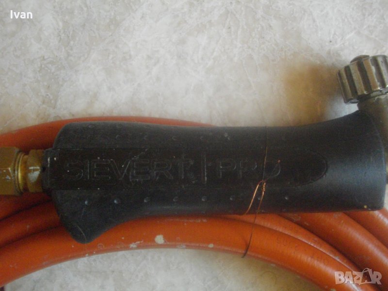 резак, наличен редуцир вентил и наличен оригинален маркуч с дължина 4 м. Марка на горелката - Sievert Pro. Произовдство вписано на редуцил винтила -Made in Italy. Данни, вписани на винтила NOVACOMET Peg APR 85. Pu - 1,5 bar. qn- 8 Kg - h. Горелката накрайник резак е с цяластна дължина - 340 мм. С 1 вентил върток отгоре за регулация на подаваната газ. Инструмента работи с големите бутилки газ. Зад редуцил винтила е наличен накрайника на маркуча за скачване с газова бутилка.Всички компонетти са със запазен външен вид и добро техн. състояние.