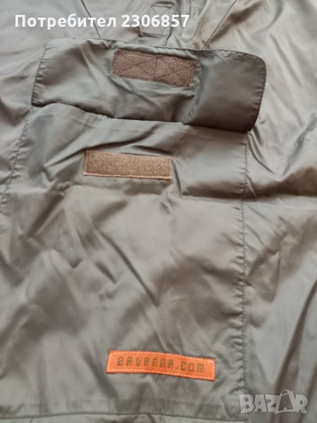 Масленозелено спортно или туристическо марково горнище от шушлекова материя, с висока яка, затваряща се с лепки, голям преден джоб с лепка, регулируем ластичен шнур долу. Шир подм.52см, дълж. от рамо 60см