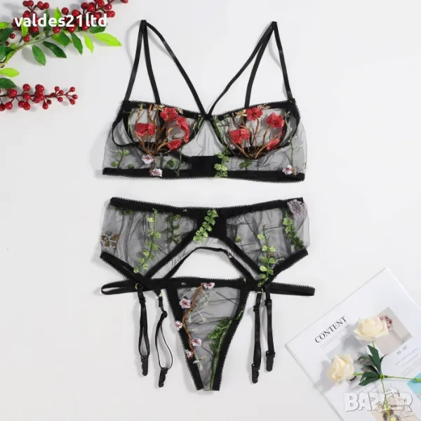 Сетът се състои от три части- сутиен, жартиерен колан с жартиери и прашки;