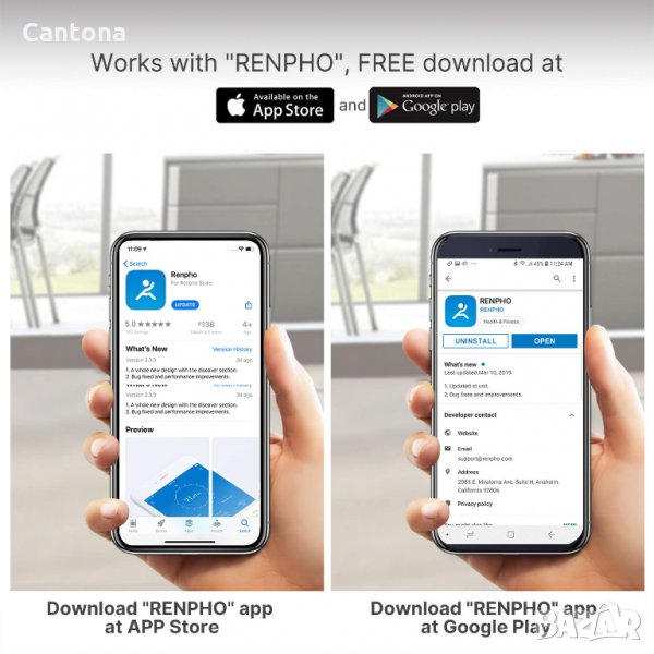 - Интелигентното приложение се синхронизира с приложението за фитнес. Приложението Renpho работи със samsung health, apple health, fitbit, google fit и предлага приложение за apple watch.