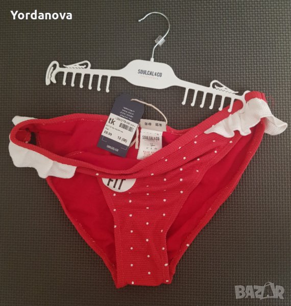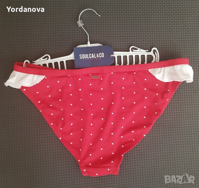 SoulCal дамско долнище на бански. Ново. Купувано от Англия. Размер М. С вафлена текстурирана материя. Дизайн на точки. Червен цвят, с бели къдрички от двете страни на ханша. Брандиране на SoulCal на задната страна. Хастар - 100% полиестер. Машинно пране.