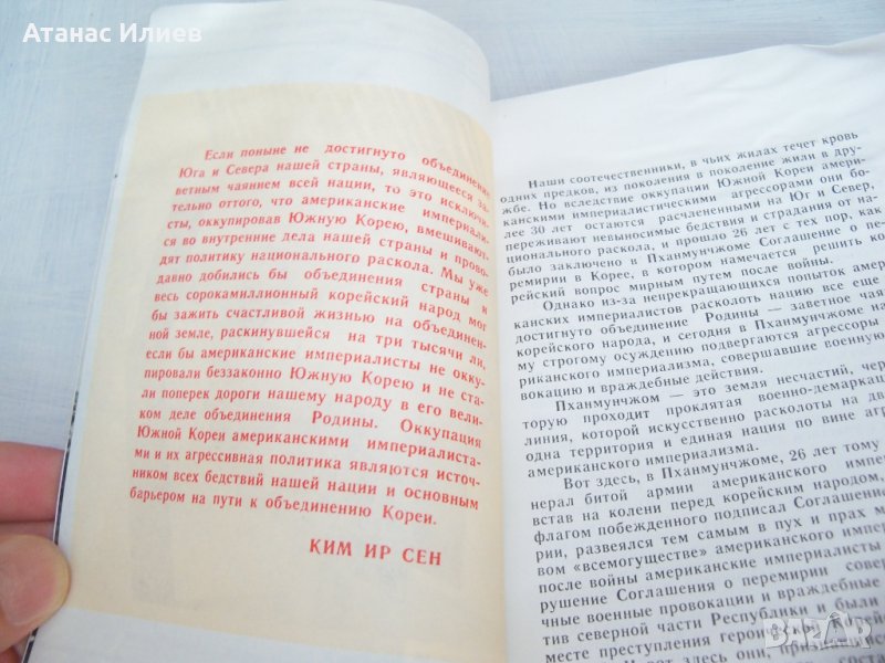 двете Кореи, Пханмунджом. Книгата е издание на Корейската народна армия и съдържа богат и интересен снимков материал. Книгата е с меки кори, 72 стр. със следи от навлажняване, но без значими поражения. Книгата е на руски език, което прави информацията леснодостъпна. Година на издаване не е посочена, но е вероятно около 1977г.