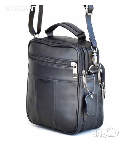 Мъжка чанта от естествена телешка кожа, с къса дръжка за носене в ръка и ремък за през рамо, сдве големи отделения, едното с вътрешен джоб с цип, а другото с джоб за телефон, три предни джоба и един заден с ципове