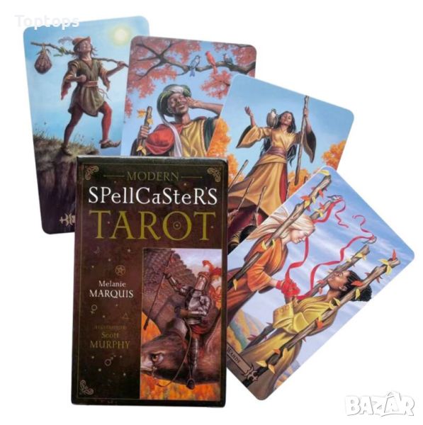 - 78 таро карти - Modern Spellcasters Tarot с пдф файл с инструкции на английски. Размерът им е 9,5см х 6см, колодата е създадена от Melanie Marquis и Scott Murphy .