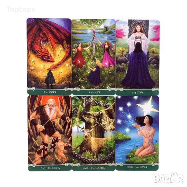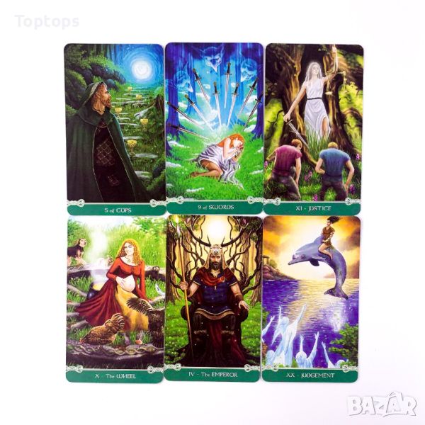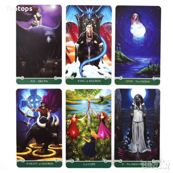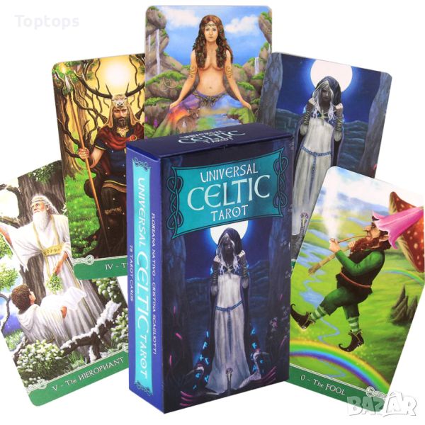 - 78 таро карти - Universal Celtic Tarot с пдф файл с инструкции на английски. Размерът им е 9,5см х 6см, колодата е създадена от Floreana Nativo, Cristina Scagliotti.