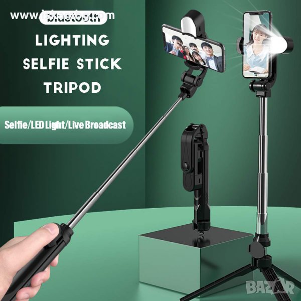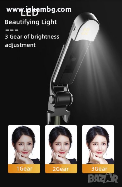 3 в 1 селфи стик с възможност за разпъване до 65 см. Това е селфи стик е с осветление-при нужда, обикновен селфи стик, и селфи стик със трипод в основата.