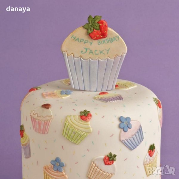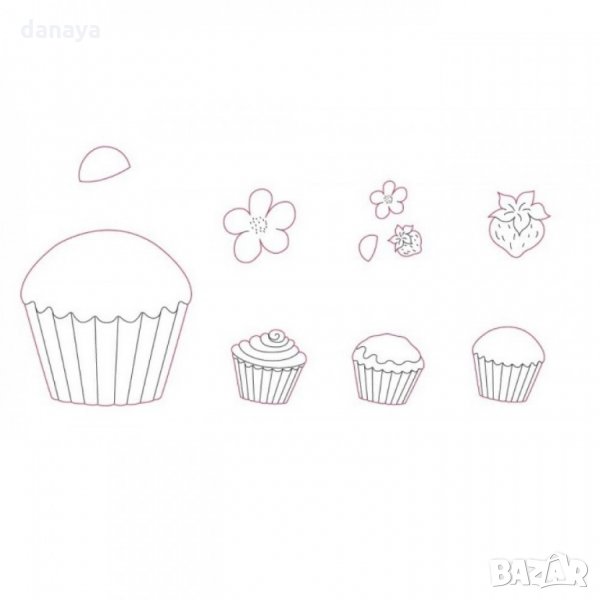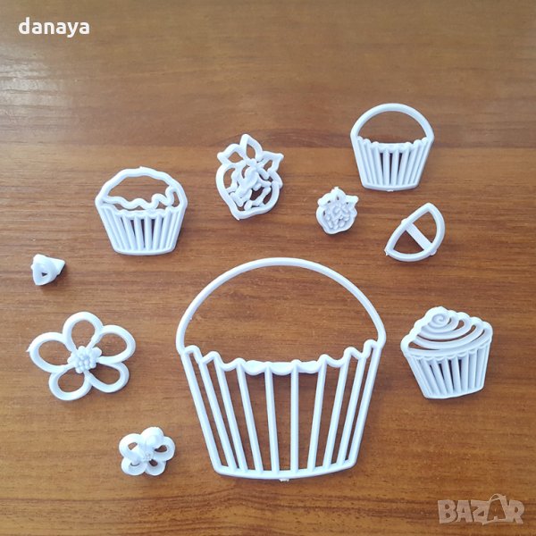 Сладкарски комплект печати за фондан с форма на мъфини, ягодки и цветенца. Всеки печат е с различна форма. Чудесни са за декориране на различни сладкиши и торти. Идеални са за работа с фондан, захарно тесто, марципан и др.