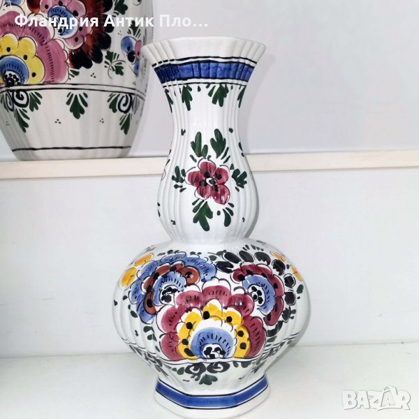 Представяме Ви сет - 3 бр. вази, изпълнен от порцелан "Delft polychrome" Комплектът се състои от една голяма, тумбеста ваза с капак и две амфорни без капак. "Делфт" порцелан е традиционен, нидерландски порцелан, който се произвежда и до днес. Красиви творения, които се раждат в малки работилници из китното, нидерландско градче Делфт, от където произлиза и името му. Всички порцеланови изделия са дело на творчески труд от ръцете на майстори, наследили занаята си от своите предшественици. Характерно за тях е да създават творения от млечно бял порцелан и собственоръчно да ги изрисуват със сини мотиви и по-рядко с цветни багри. Непреходно е увлечението на ценителите по техните творения и затова те се налагат, като тренд в порцелановата индустрия.