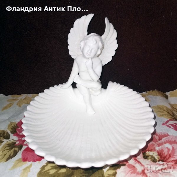 Голяма отворена бижутерка със статуетка на ангелче, изработена от бял порцелан.
