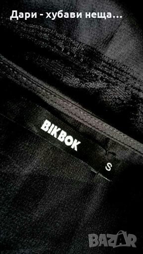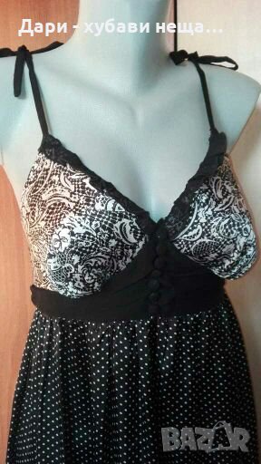 Кокетна имного нежна рокля!Цялата е от сатен - гладка и мека.Около деколтето и под гърдите има украса от черен шифон.От ляво се закопчава с цип, а на гърба е на ластик, който се разпъват доста.Обхваща размери S и М.Дължината е около, или малко под коляното(зависи от ръста.