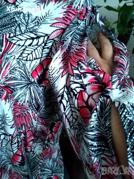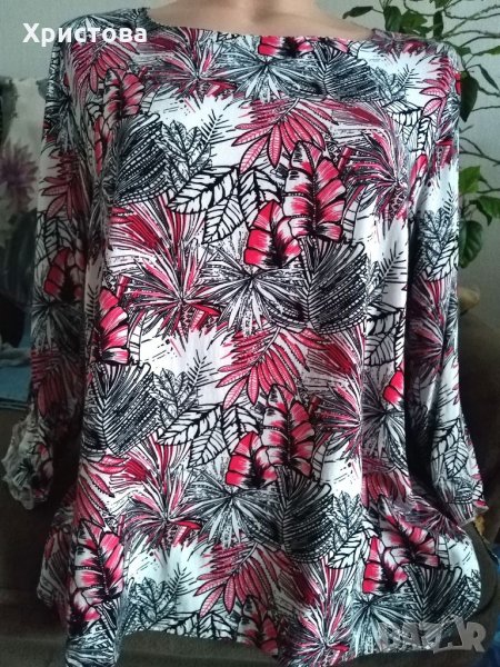 -Блуза с 3/4 ръкав с два отвора по външния му шев; в бяло, черно и червено- на листа, размер L(памук и полиестер) . Дължина от рамо 62 см, дължина ръкав 44 см. От рамо до рамо 43 см. Обиколки :бюст 106 см, талия 108 см, в долния край 114 см. Снимки 6 и 7.Цена 7 лв.