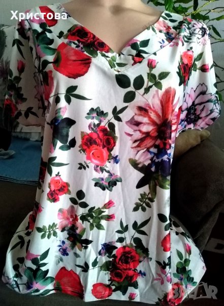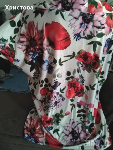 - Цветна блуза с къс паднал ръкав в бежово, червено зелено..., на цветя, с V-образно деколте,на B. YOUNG. 95% полиестер, 5% еластан. Дължина от рамо 65 см. От края на единия ръкав до края на другия 74 см. Обиколки: бюст 110 см, талия 100 см, в долния край 106 см+. Снимки 4 и 5.Цена 7 лв.