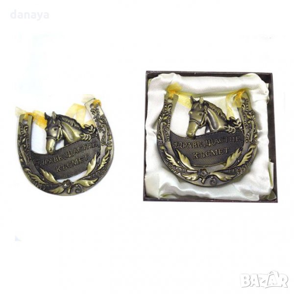 подкова с послание ЗДРАВЕ, ЩАСТИЕ, КЪСМЕТ. Декорирана с красиви цветни орнаменти и глава на кон в средата. Закача се на стена с помощта на нежна панделка. Чудесен мини подарък за нов дом или офис. Подковата е поставена в стилна подаръчна кутия, на гърба на която има текст – ” Най-искрени пожелания за здраве и късмет, за дни на радост и веселие, за мигове на сбъднати мечти!”