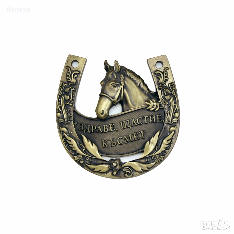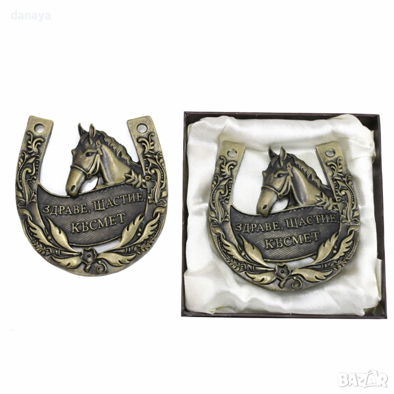 подкова с послание ЗДРАВЕ, ЩАСТИЕ, КЪСМЕТ. Декорирана с красиви цветни орнаменти и глава на кон в средата. Закача се на стена с помощта на нежна панделка. Чудесен мини подарък за нов дом или офис. Подковата е поставена в стилна подаръчна кутия, на гърба на която има текст – ” Най-искрени пожелания за здраве и късмет, за дни на радост и веселие, за мигове на сбъднати мечти!”