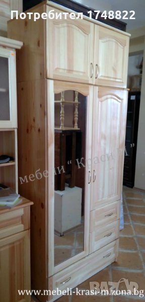 ГАРДЕРОБ КОМБИНИРАН-МАСИВ С ОГЛЕДАЛО.ИЗРАБОТЕН ОТ ИГЛОЛИСТНА ДЪРВЕСИНА /БОР/.ЕДНОТО КРИЛО,ТОВА С ОГЛЕДАЛОТО НО ВРАТАТА Е ЗА ВИСЯЩИ ДРЕХИ,А ДРУГОТО КРИЛО Е С ДВА РАФТА- ТРИ ПРЕГРАДИ,ЕДНО ГОЛЯМО И ДВЕ МАЛКИ ЧЕКМЕДЖЕТА С ТЕЛЕСКОПИЧЕН МЕХАНИЗЪМ И ПАНТИ С ПЛАВНО ЗАТВАРЯНЕ.РАЗМЕРИ 80/50/220см.