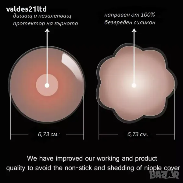 Аксесоар, предназначен за прикриване на зърната, които добавят дискретност и стил. Те са отличен избор за дами, които искат както практичност и естетика. Подходящи както за ежедневна употреба, така и за специални поводи. Водоустойчиви, което ги прави подходящи за плаж или басейн. Перфектни за носене под прозрачни или прилепнали дрехи, без да се виждат контури.