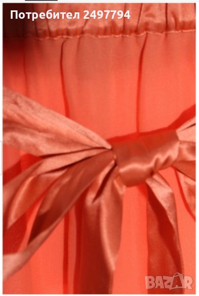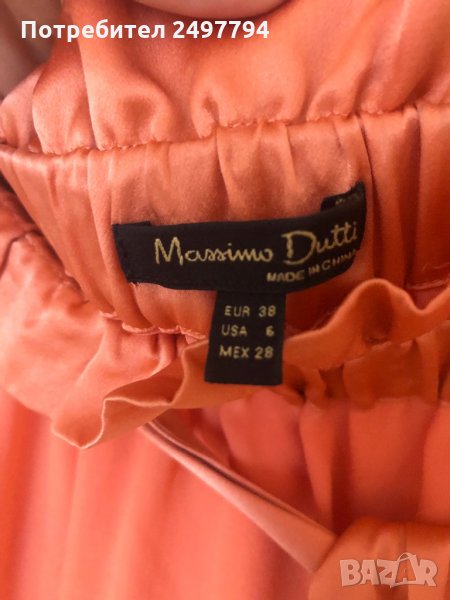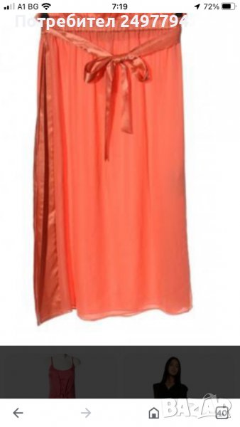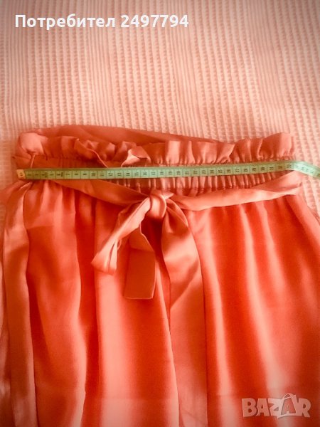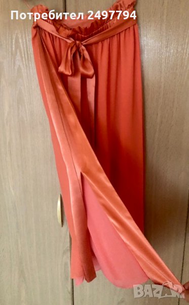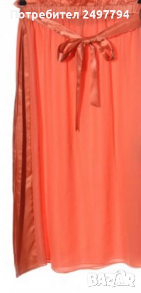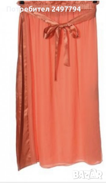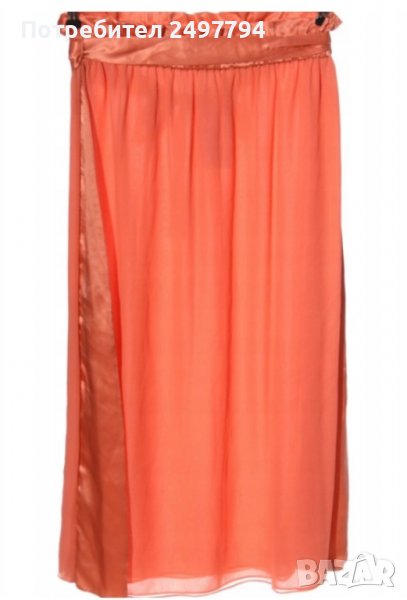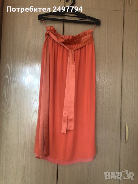 Пола от коприна и детайли от сатен в талията и отстрани, две странични цепки, с ластик в талията, колан от сатен. Обличана е един път по официален повод. Много удобна, стилна, в нежен коралов цвят.