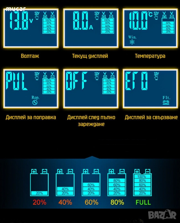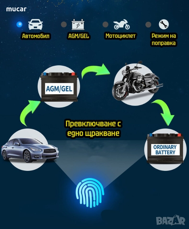 - 3-степенното зарядно устройство е подходящо за повечето типове акумулаторни батерии включително Калциеви, EFB, Гелови, тягови, AGM, VRLA и мокри батерии. То може да спомогне за възстановяването на силно изтощени и сулфатизирани батерии.