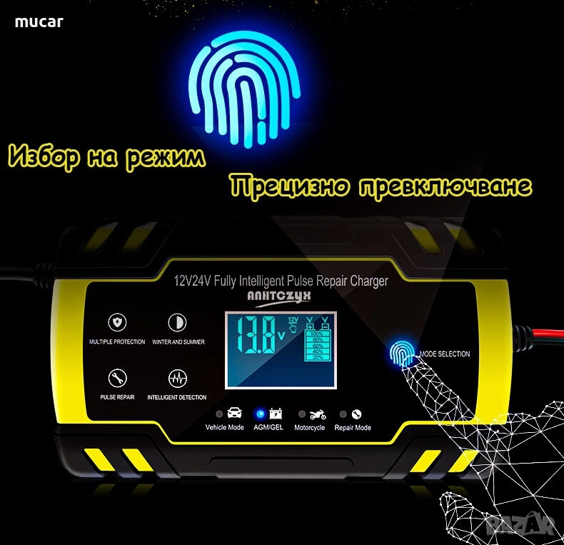 3-степенно универсално умно зарядно устройство за различни видове акумулатори на 12V или 24V – Тягов, AGM, GEL, VRLA, EFB, мокри, стартови, калциеви. Максимален заряден ток на 12V – 8A, на 24V – 4A. Зарядното устройство разполага с LCD дисплей, както и с функция за десулфатизация на сулфатизиран акумулатор, което може да вдъхне „нов живот“ на вече „отписан“ акумулатор.