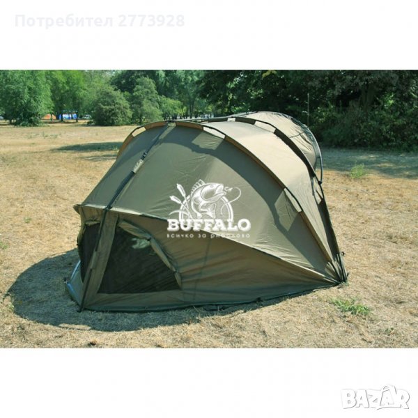 Първокласнa, супер висококачествена просторна двуместна палатка със здрава, стабилна и надеждна алуминиева конструкция и под (основа) от устойчив PVC материал. Проектирана и изработена от най-модерните, най-съвременните и надеждни водоусточиви материали, издържащи 10000 mm. хидростатично налягане (воден стълб). Предната част на палатката има просторна врата и два прозореца с вградена мрежа против комари (комарници). За по-голямо удобство и бързина, всичко е проектирано и направено с велкро ленти и подвижни елементи, които могат да се комбинират по желание, както и цялата предна част на палатката, при нужда, ако е необходимо и по желание, може също да бъде премахната. Всичко това е възможно да бъде направено, посредством ципове и катарами. На гърба на палатката има обособени два по-големи отвора, за по-добра вентилация и циркулация на свеж и чист въздух. Те също са снабдени с мрежи против комари, а за достигане на максималем комфорт са снабдени и с дъждобранни клапи. В тази палатка без никакъв проблем могат да се поберат 2 шаранджийки легла с размери от 210 cm. х 82 cm. При нужда и желание по средата може спокойно да се разпъне и 1 шаранджийски стол с размери 52 cm. x 55 cm. x 92 cm. Това е едно от най-прецизно изработваните, висококачествени, палатки, предлагани на Европейския пазар и е предназначена за приятен и комфортен престой, релакс и излети сред природата на двама рибари или туриста.Сигурна защита от дъжд, слънце и вятър! Отличен избор за максимум удобство и комфорт! Няма да съжалявате!