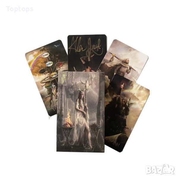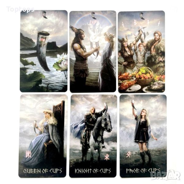 - 78 таро карти - Runic Tarot заедно с пдф файл с инструкции на английски, италиански, испански, френски, португалски, руски. Размерът им е 10,5см х 6,3см, колодата е създадена от Jack Sephiroth и Jaymi Elford.