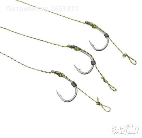 Комплектът включва три вързани монтажа на косъм, игла за монтажи и 12 броя стопери за шаранджийски риболов. Монтажите са изработени с помощта на висококачествен вирбел и подходящо плетено влакно в камуфлажен цвят, който прави повода незабележим на дъното. Куките са ковани, перфектно заточени с обла извивка и
