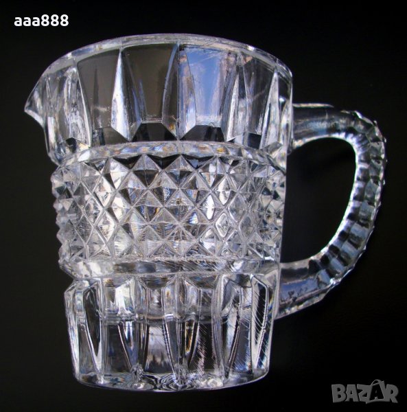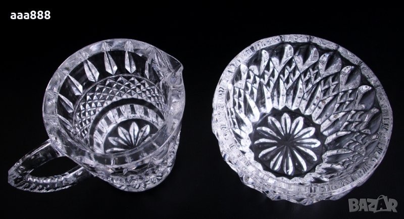 Комплект две сосиери с форма на купа и кана от лят кристал. Нови, неупотребявани, без забележки. Изцяло покрити с орнаменти и фасети. Масивни и стабилни. Дебелина на стената 6 мм. Дръжката на каничката е с удобен и сигурен захват.