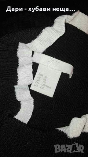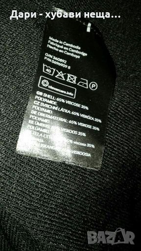 Без хартиен етикет.Много еластична и плътна блуза,от вискоза и полиамид, с красиви накъдрени бели биета при яката и ръкавите.Материята има лека лъскавина, която успях да уловя на снимка.Подходяща е за комбинация и със сако.Спокойно обхваща размери от M/L до XL включително.