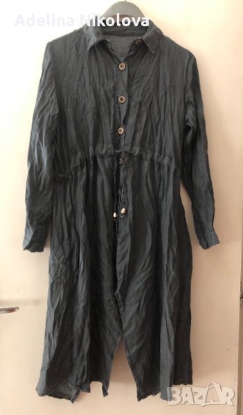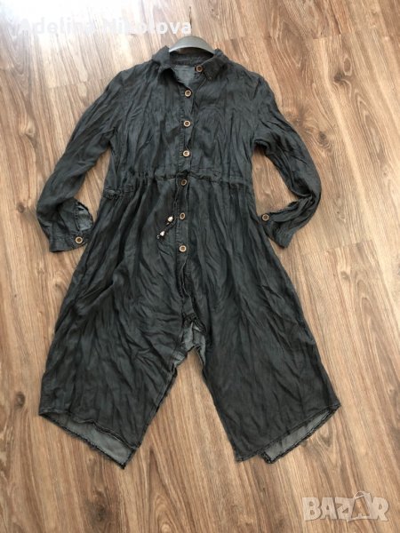 Носена веднъж, тъничък дънков плат/ тенсел/, гр обиколка 110см , в средата по- къса , отстрани по- дълга -98см, с връзки на талията, може да се носи като риза