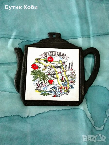 Поставка за горещи продукти от керамична плочка и чугунена рамка във формата на чайник. Размер : 17х15см.