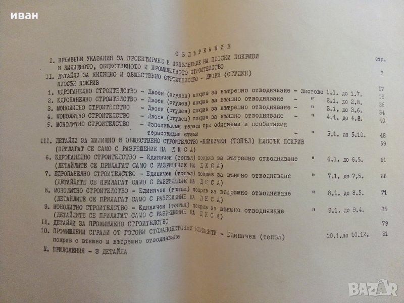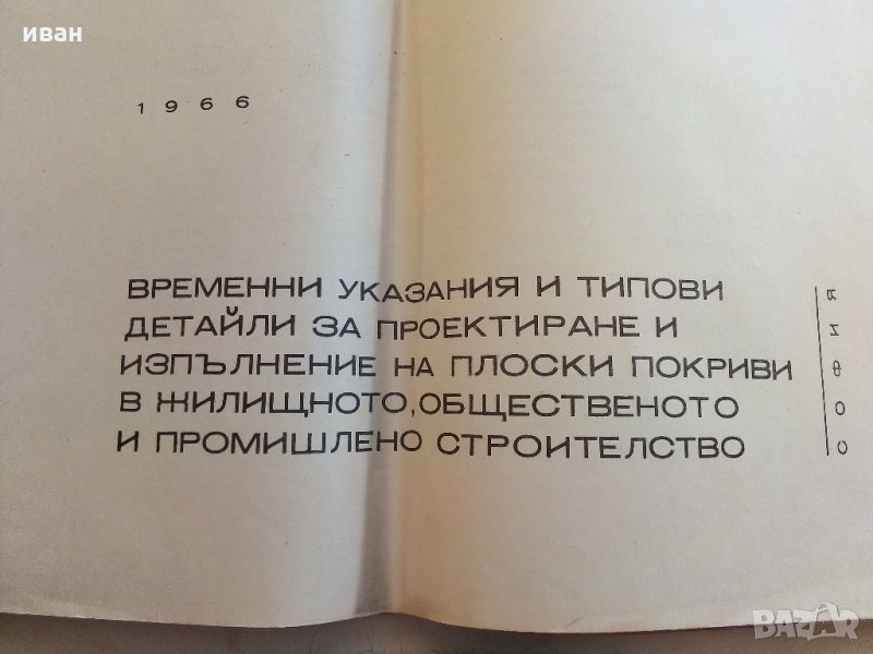 1966 г. - Временни указания и типови детайли за проектиране и изпълнение на плоски покриви в жилищното,общественото и промишлено строителство - 92 стр.Меки корици,добро състояние
