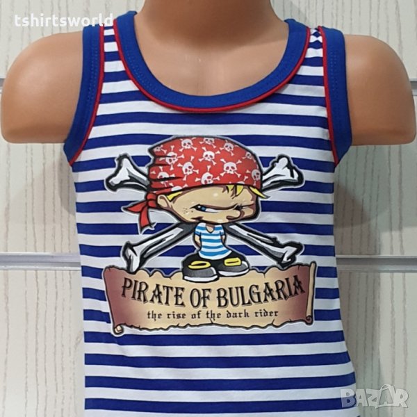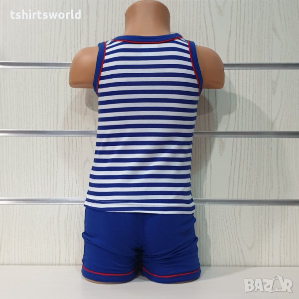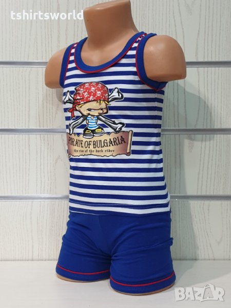 Страхотно ново класическо детско моряшко комплектче на синьо и бяло райе от две части: потник и къси панталонки. Потничето е на райе, Х-гръб и трансферен печат Пират, късите панталонки са изчистени в син цвят. Произведено е в България под марката PRINTEX от 100% висококачествен памучен плат, което не позволява да се измачка, а тънката материя придава комфорт и удобство на вашето дете. Подходящо за носене в горещите летни дни както в ежедневни условия, така и за тематични събития.