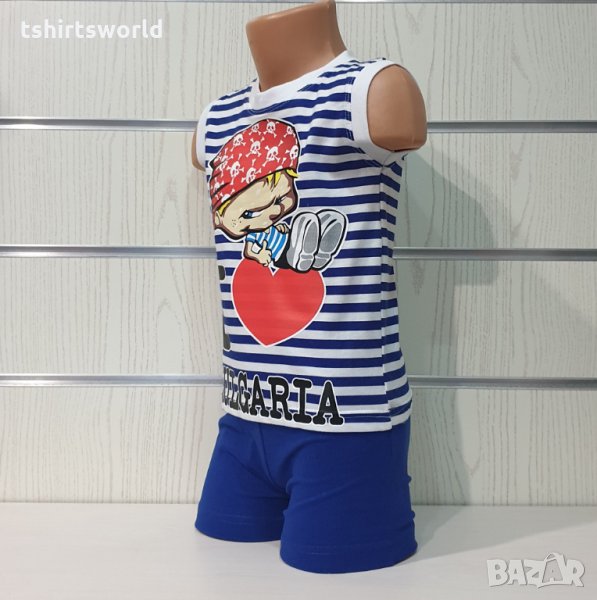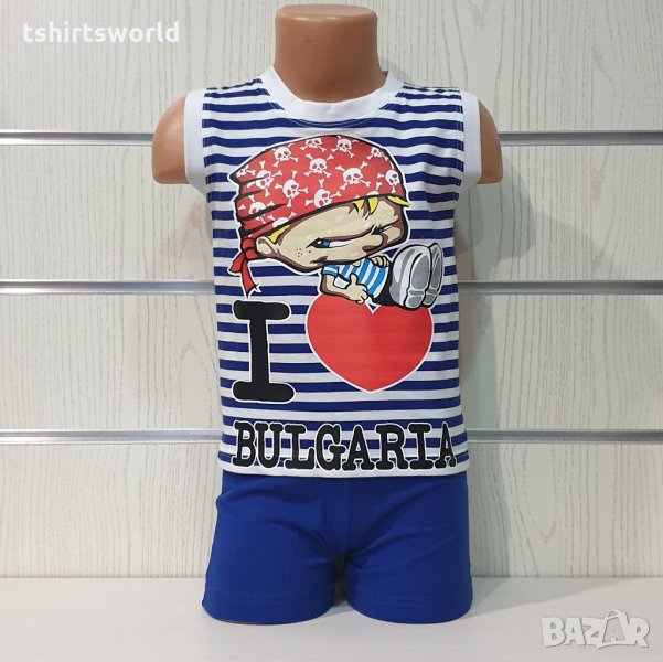 Страхотно ново класическо детско моряшко комплектче от две части на синьо и бяло райе: с блузка без ръкав и трансферен печат Пират-I Love Bulgaria и къси панталонки цвят Ротманс. Произведено е в България под марката PRINTEX от 100% висококачествен памучен плат, което не позволява да се измачка, а тънката материя придава комфорт и удобство на вашето дете. Подходящо за носене в горещите летни дни както в ежедневни условия, така и за тематични събития.