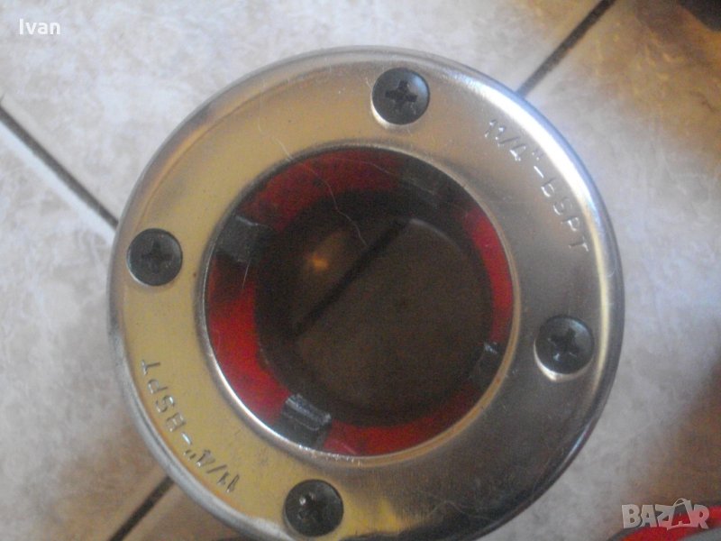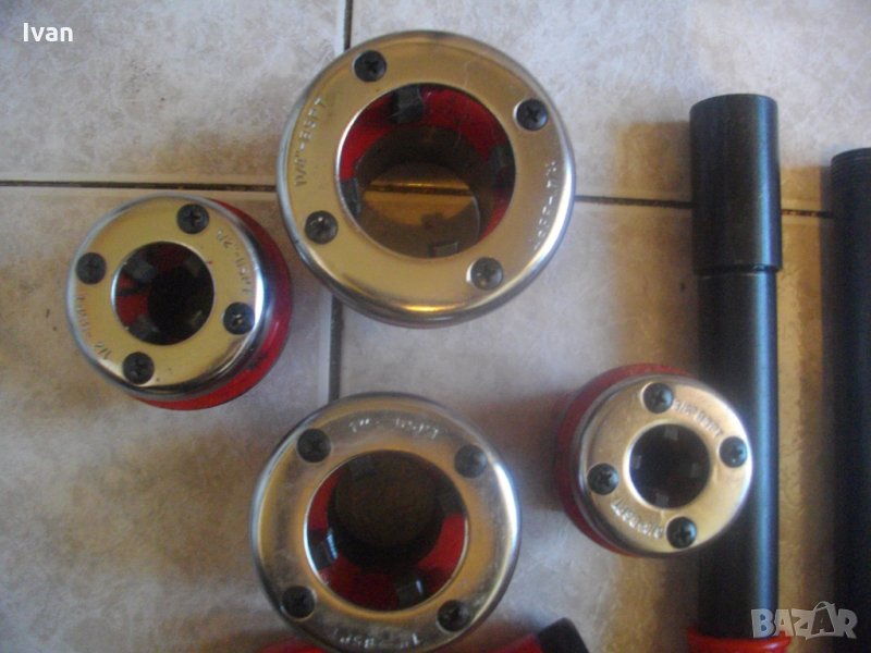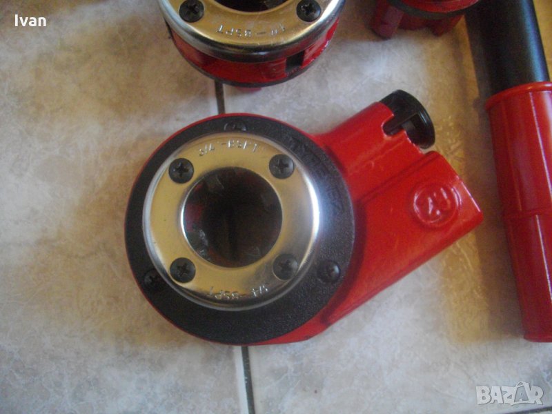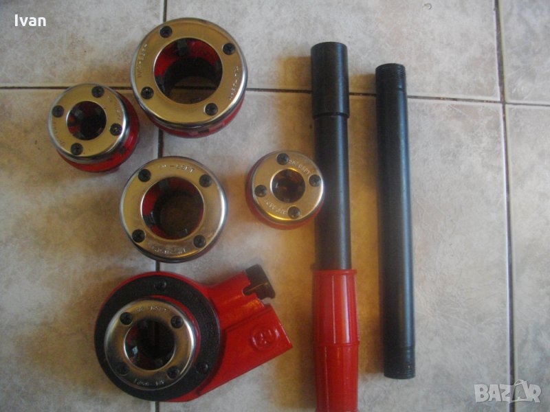 винторезка - рамо с държач и 5 броя глави, различни размери ,за правене на резби на тръби с различни размери. марка на комплекта - Type 62. Инструмента е ползван веднъж, като нов е, на практика е нов. В отлично техническо сътояние.