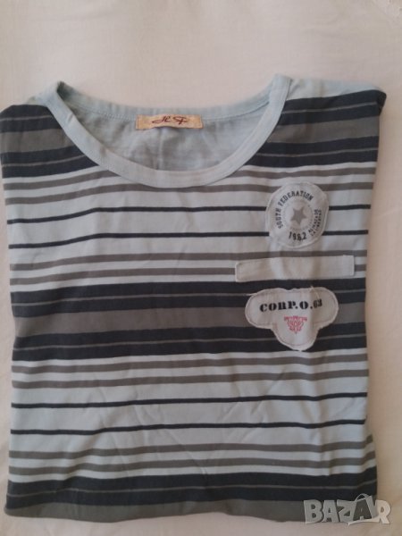 Мъжка блуза фланелка къс ръкав на райета с надписи, материя 95 % памук, размер Л. Отговарям на съобщения тук, изпращам с куриер с отстъпка, преглед и тест, или лично предаване в София.