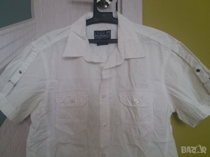 Мъжка спортна бяла риза с къс ръкав EXSIDE, с 2 предни джоба с капачета и копчета, материята е памук, много хубава здрава риза, почти не е носена, като нова. Размер L рамене 44 см, гърди 54 см /108 см/, дължина 66 см. Отговарям на съобщения тук, изпращам с куриер или лично предаване в София...